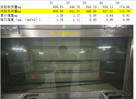 2023年浙江******產(chǎn)品檢驗有限公司第二次采購我司一臺型號為“WHQ-900B”型的混合氣體腐蝕試驗箱,設(shè)備在出廠之前,工作人員已經(jīng)在我內(nèi)部的實驗室進(jìn)行過一次合格的銅片增重測試,之后設(shè)備被運(yùn)送到客戶指定的場地安裝調(diào)試運(yùn)行。客戶在設(shè)備運(yùn)行了一個階段后,自行進(jìn)行一次銅片增重試驗,試驗結(jié)束之后客戶將數(shù)據(jù)發(fā)給我司,以下是客戶和我的聊天記錄和客戶第一次做的數(shù)據(jù):